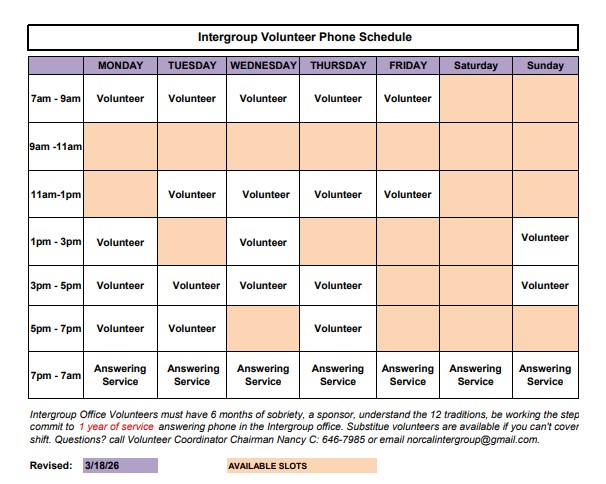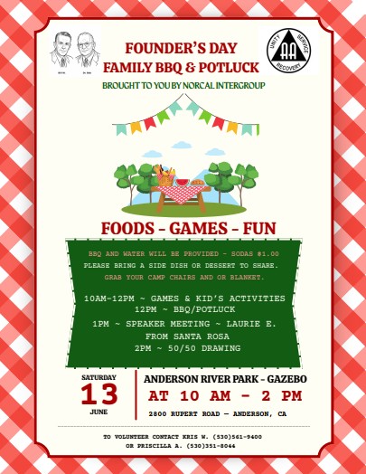 Disclaimer: “by AA, for AA or about AA. Events listed here are presented solely as a service to readers, not as an endorsement by the NorCal Intergroup. We cannot attest to the accuracy, relevancy, timeliness, or completeness of information provided by any linked site. For any additional information, please use the event contact information provided.”