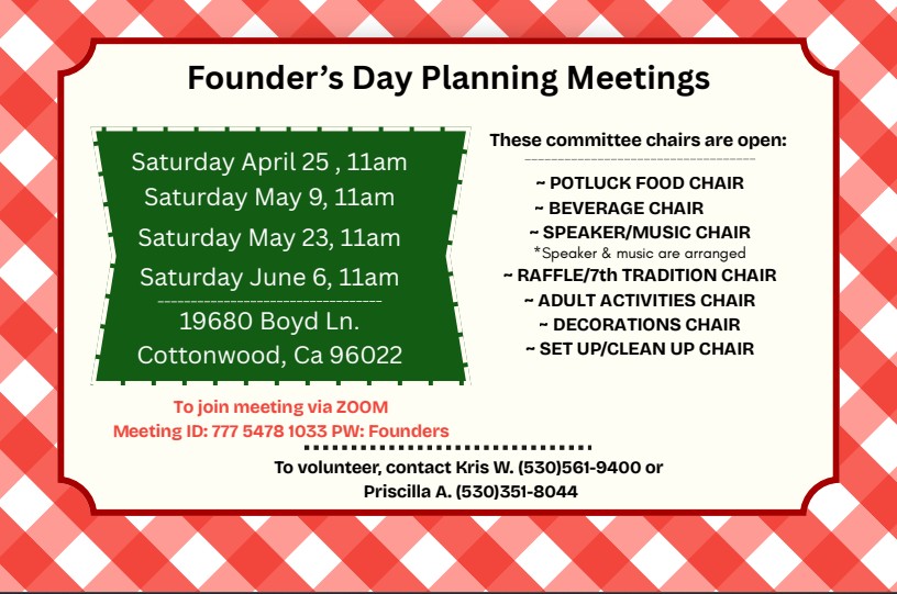 Intergroup Founder’s Day Picnic Committee Meetings ~ Saturday, April 25th