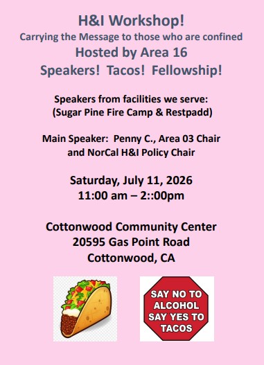 SHASTA COUNTY (Area 16) H & I Monthly Business Meeting ~ Tuesday, May 5th